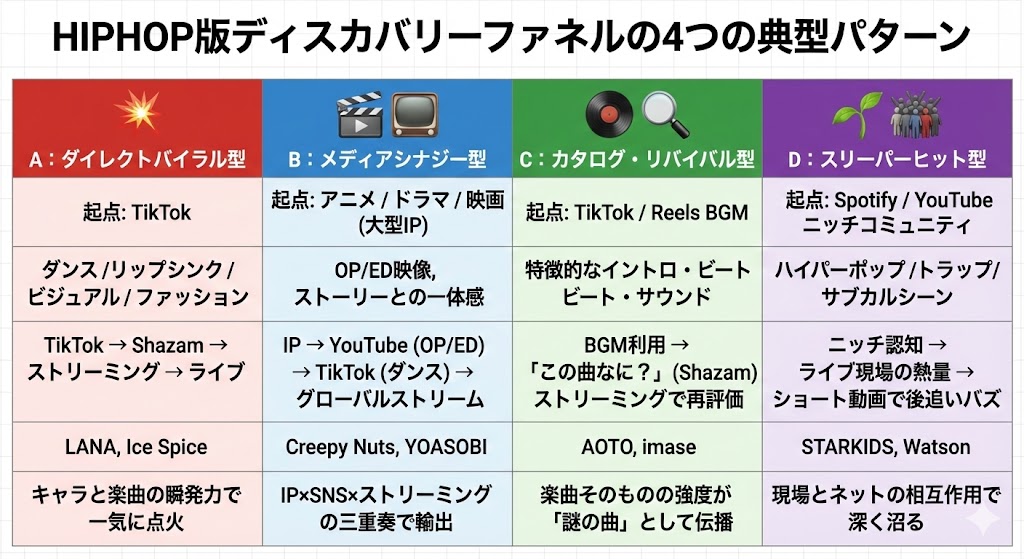 HIPHOPCSがここ数年の国内外シーンを追ってきた感覚と、各種データ・現場の声を総合すると、ヒットの経路はおおまかに4つのパターンに整理できる。