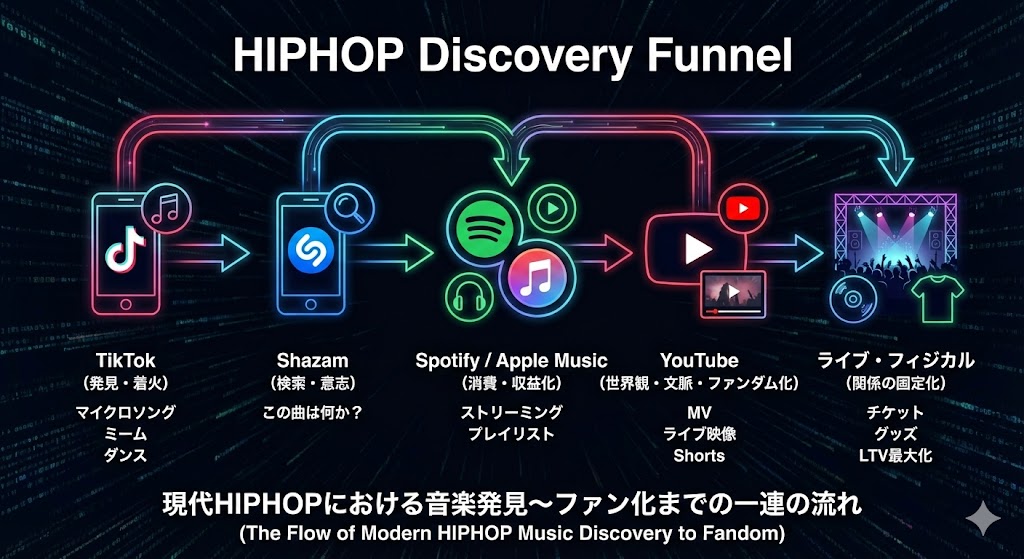TikTokでバズる → Shazamで検索される → Spotify / Apple Musicで聴かれる → YouTubeで世界観を見せる → ライブや物販で長期の関係になる──。このディスカバリーファネル全体をどう設計するかが、2025年以降のHIPHOPにとって決定的に重要である。