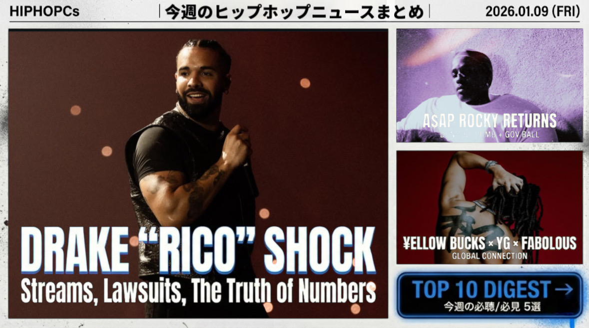 2026年の幕開けは、ヒップホップにとって法と音楽の境界線が問い直される1週間となりましたね。DrakeへのRICO訴訟 [1][2]、6ix9ineの収監開始 [12]、Diddyの恩赦却下 [13]──法廷ニュースが連日ヘッドラインを飾る一方で、A$AP Rockyの8年ぶりアルバム発表 [4][5]、Governors Ball/Rolling Loudの2026年ラインナップ公開、そしてなんと日本では¥ellow BucksのYG/Fabolous参加アルバム [7][8] と、音楽の熱量も確実に上がっています。この週報では、USと日本の動きを横断しながら、なぜ今これが重要なのか読み解いていきましょう。