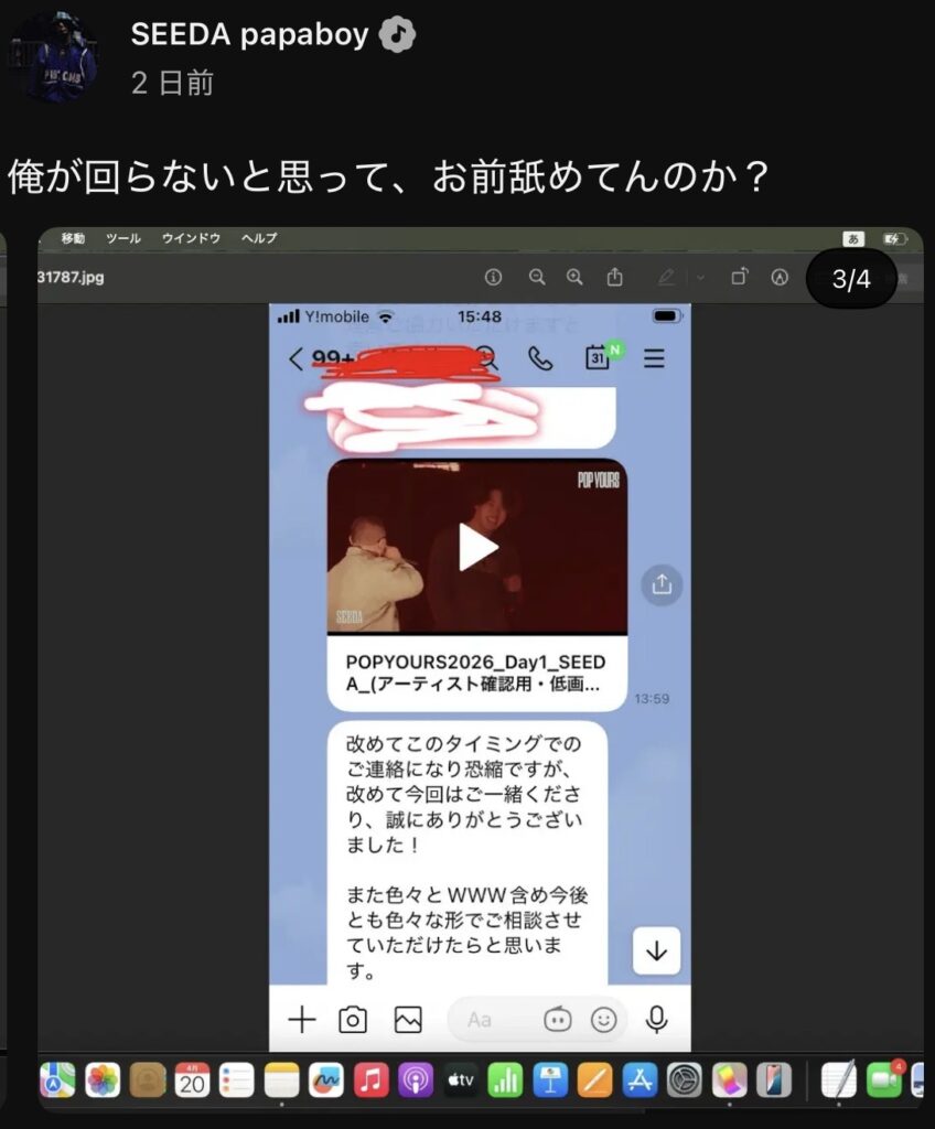 4月20日、SEEDAは自身のYouTubeチャンネル「SEEDA papaboy」のコミュニティ投稿で、フェス運営との一連のやり取りを、本人の声明文と計4枚のLINEスクリーンショットとして公開した。投稿は2件に分けて行われ、声明文側がいいね1667/コメント81、LINEスクリーンショット側がいいね1743/コメント133を集めている(4月22日時点)。本記事はこの本人公開情報を、唯一かつ最高位の一次情報源として扱う。